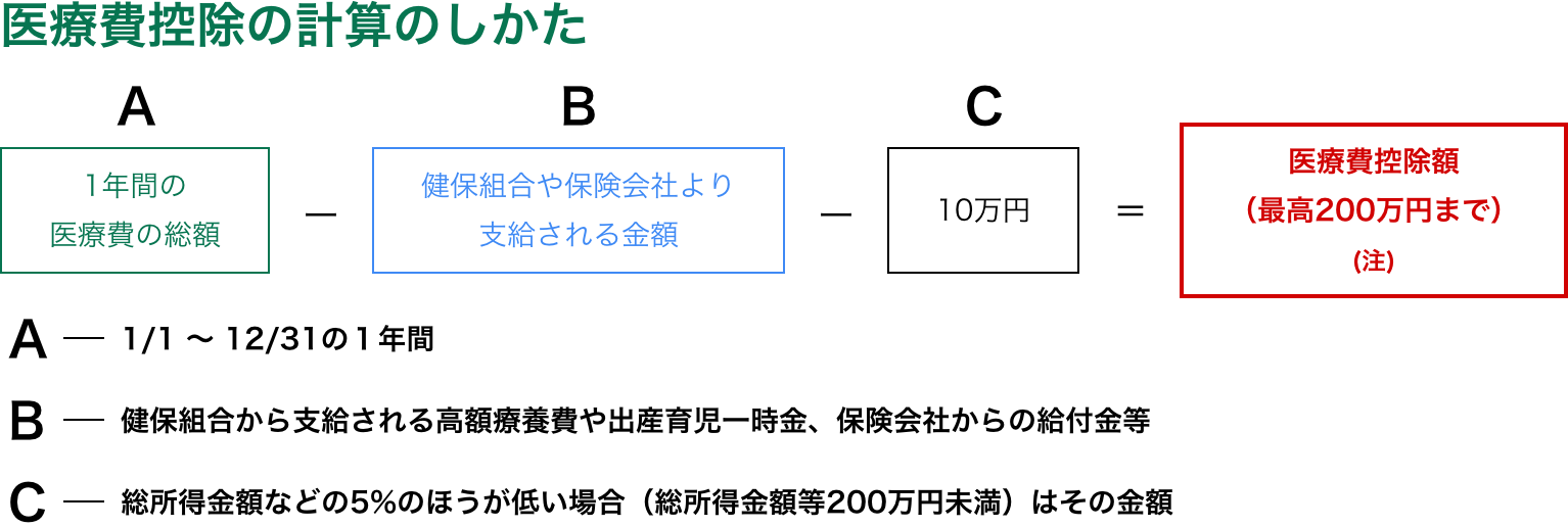 一家で支払った医療費(健康保険などで補てんされた金額を除く)が年間10 万円(または年間所得金額の5%のいずれか少ないほう)を超えたときは、その超えた額(最高200 万円まで)を総所得金額から控除することが認められています。